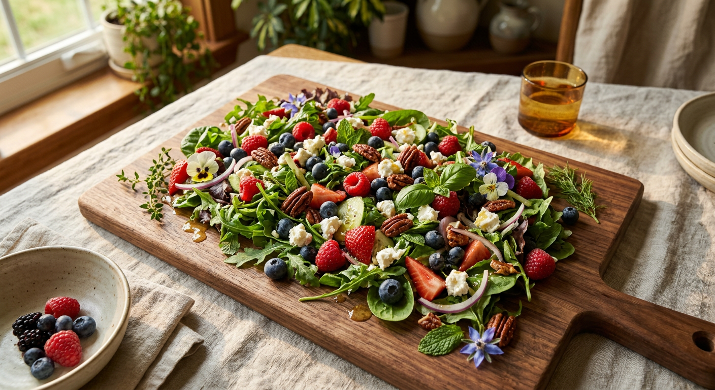 A refreshing summer salad with mixed greens, fresh berries, goat cheese, and candied pecans, dressed with a light honey-dijon vinaigrette.