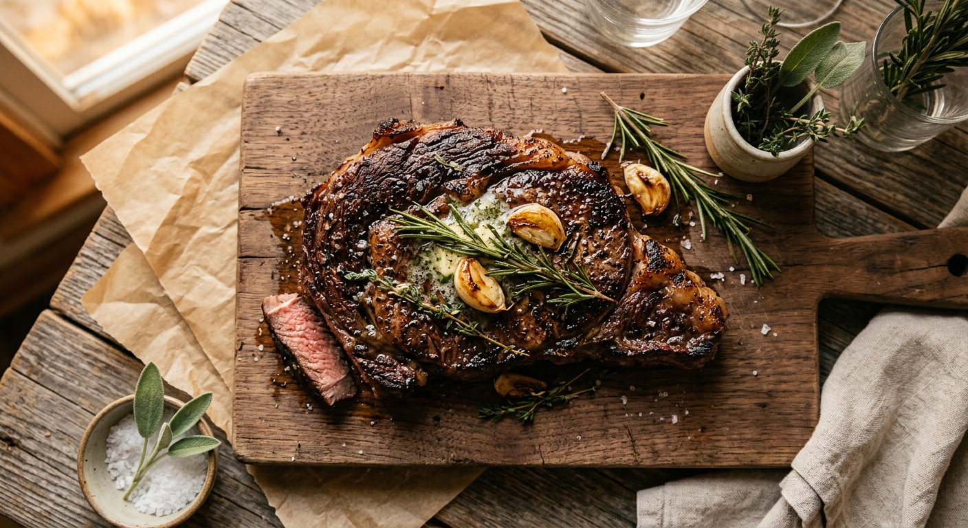Pan-seared ribeye steak with garlic, butter, and rosemary.