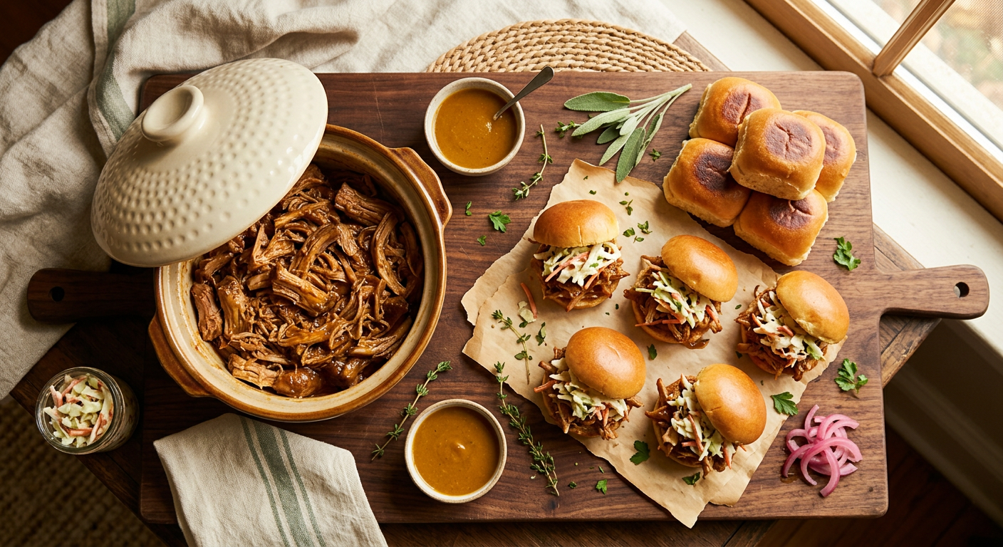 Tender slow-cooked pulled pork shoulder, perfect for casual gatherings. Transport in a crockpot, serve with buns on the side.