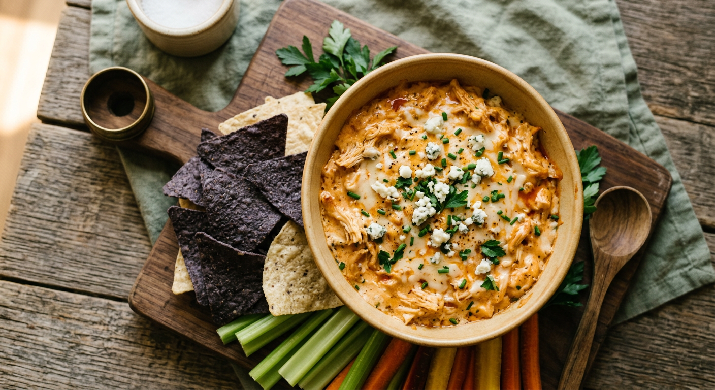 Creamy, spicy chicken dip with cream cheese, ranch, and hot sauce. Serve with chips or celery.
