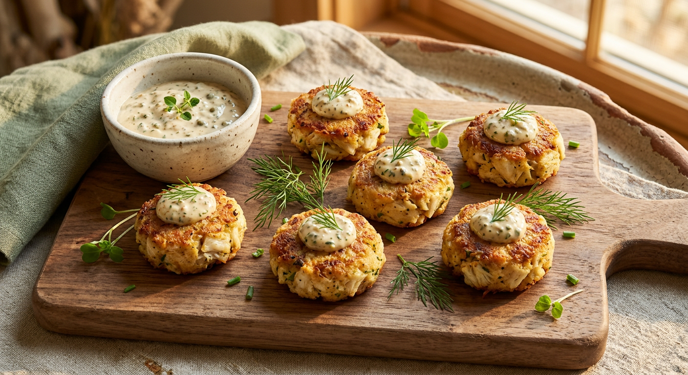 Gently fold lump crab with mayo, dijon, Old Bay, egg, and minimal breadcrumbs. Form small cakes and chill 30 min. Pan-sear in butter until golden. Serve with lemon remoulade.