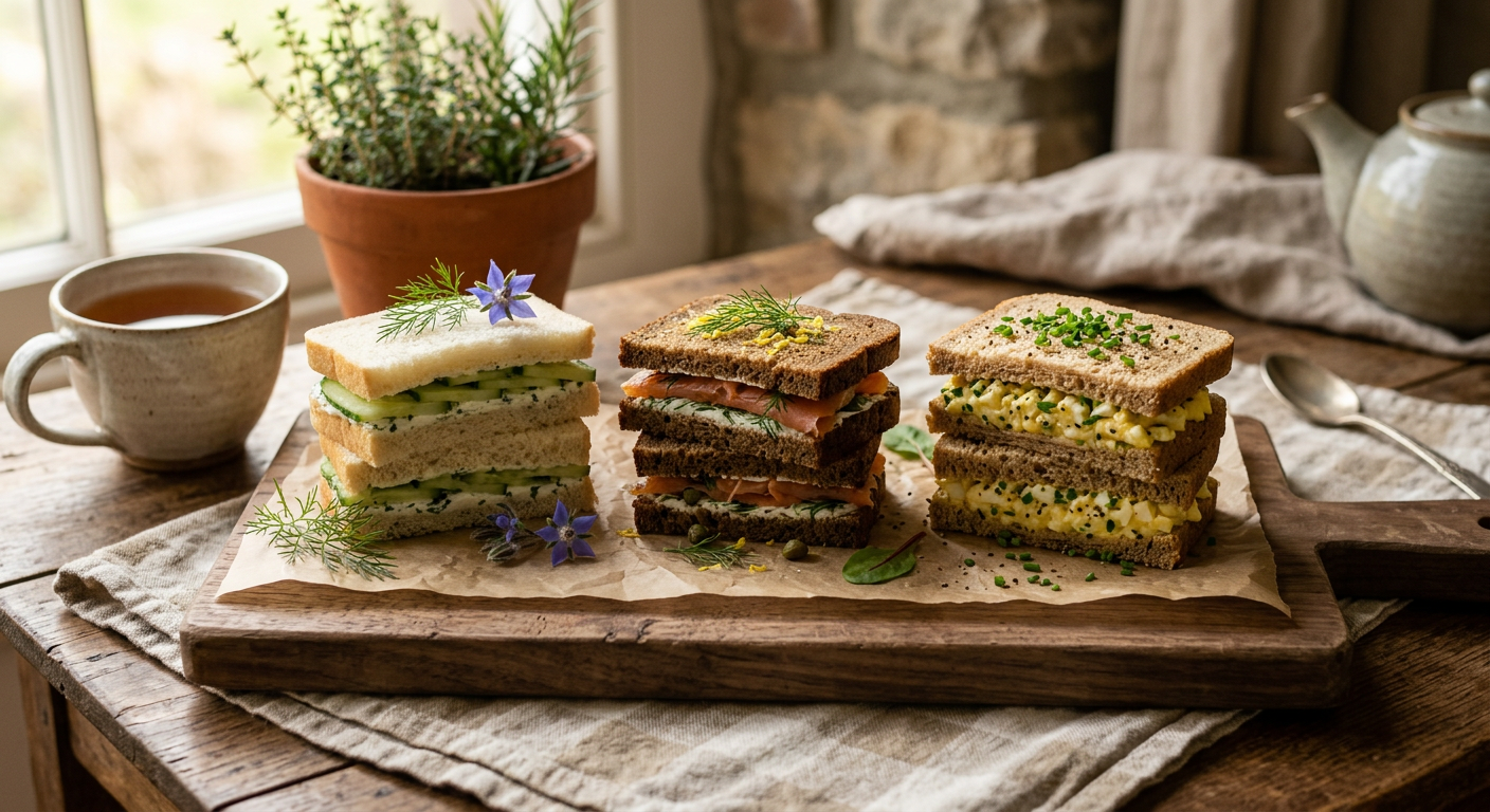 A trio of classic tea sandwiches: cucumber and cream cheese, smoked salmon and dill, and egg salad with chives.