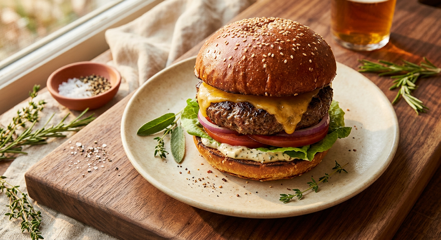 A mighty burger fit for a champion, featuring a juicy beef patty, sharp cheddar cheese, and fresh vegetables all served on a toasted bun.