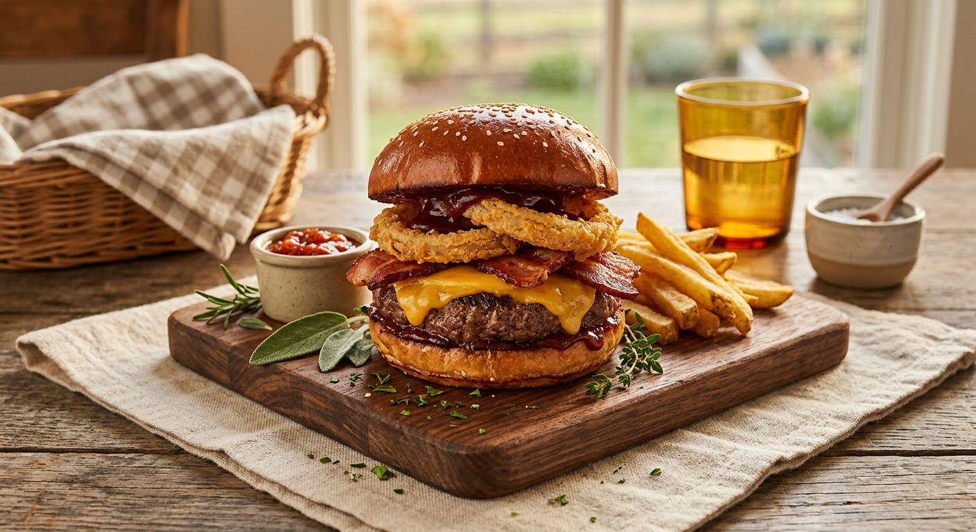 A hearty burger topped with cheddar, crispy bacon, tangy BBQ sauce, and crunchy onion rings, served on a toasted bun.