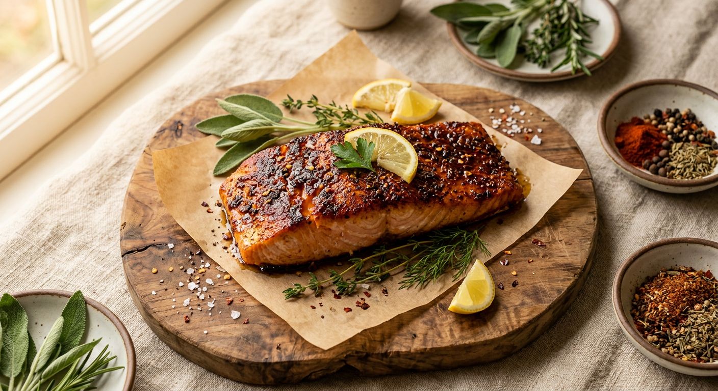 A perfectly pan-seared salmon fillet, encrusted with a sweet and smoky blend of brown sugar and spices, delivering a "blazing" flavor experience with a hint of heat. Sure to be a Big Fixin' Features favorite!