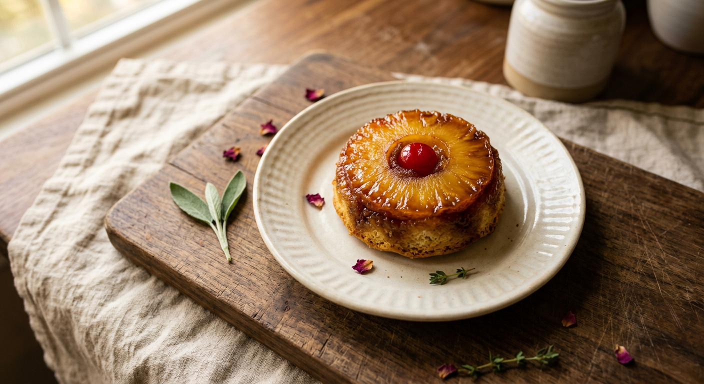 A single-serving pineapple upside-down cake, perfect for individual guests. This moist cake features a caramelized pineapple ring and a maraschino cherry on top, baked into a rich, buttery brown sugar topping. The cake base is a tender vanilla sponge.