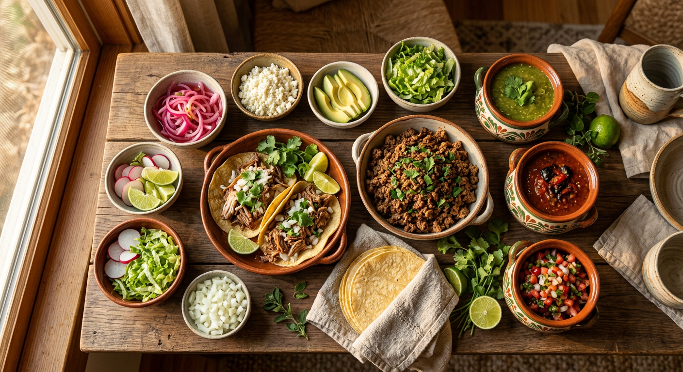 A build-your-own taco bar featuring seasoned pork and beef, with a variety of fresh toppings and salsas.