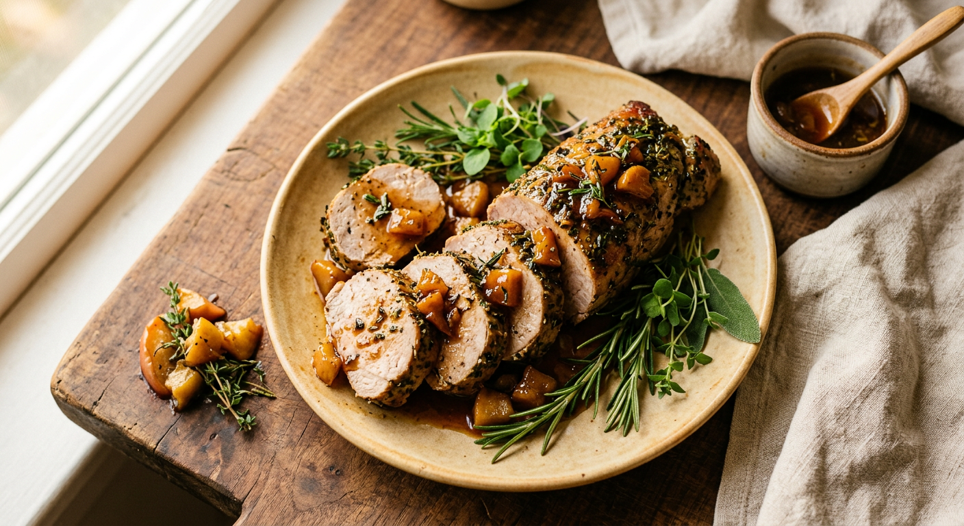 Season pork with herbs and sear. Roast at 400°F until 145°F internal. For glaze: reduce apple cider with brown sugar, mustard, and apple cider vinegar. Slice and drizzle.