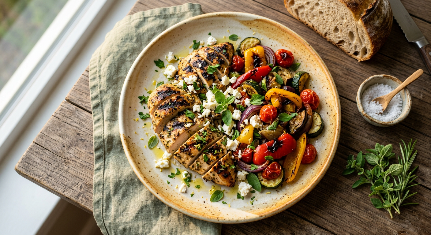 Grilled chicken breast marinated in Mediterranean spices, served with roasted mixed vegetables and crumbled feta cheese.